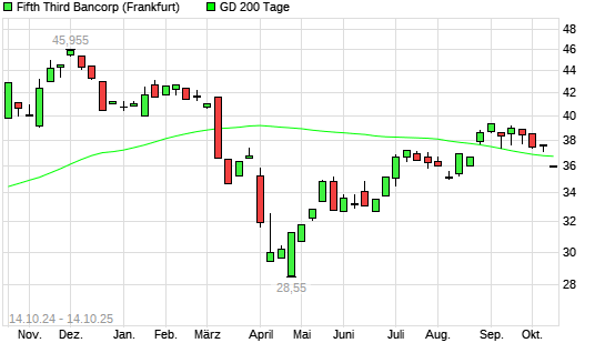 Mit dem Rücksetzer auf 35,93 EUR hat die Fifth Third Bancorp-Aktie am 13.10.2025 die 200-Tage-Linie nach unten gekreuzt.Die Fifth Third Bancorp-Aktie befand sich seit dem 25.08.2025 im ...weiterlesen
