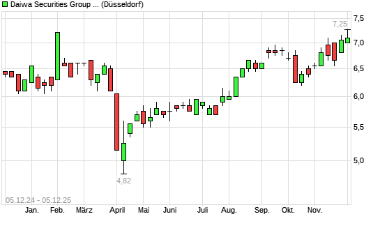 Mit dem Anstieg auf 7,20 EUR hat die Daiwa Securities Group-Aktie (ISIN JP3502200003) am 04.12.2025 ein neues 12-Monats-Hoch erreicht und damit den Kurs vom 31.01.2025 eingestellt.Die Daiwa ...weiterlesen