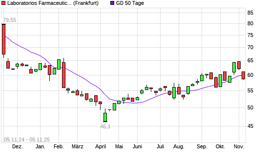 Mit dem Rücksetzer auf 58,75 EUR hat die Laboratorios Farmaceut.-Aktie am 04.11.2025 die 50-Tage-Linie nach unten gekreuzt.Die Laboratorios Farmaceut.-Aktie befindet sich seit dem 18.08.2025 ...weiterlesen