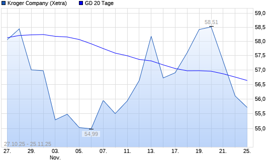 Mit dem Anstieg auf 56,67 EUR hat die Kroger Company-Aktie am 26.11.2025 die 20-Tage-Linie nach oben gekreuzt.Die Kroger Company-Aktie befindet sich seit dem 22.08.2025 im langfristigen Abwärtstrend ...weiterlesen