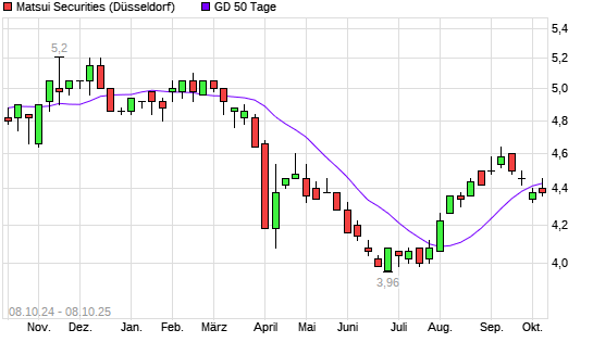 Mit dem Rücksetzer auf 4,32 EUR hat die Matsui Securities-Aktie am 07.10.2025 die 50-Tage-Linie nach unten gekreuzt.Die Matsui Securities-Aktie befindet sich seit dem 19.09.2025 im langfristigen ...weiterlesen