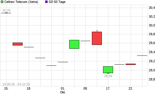 Mit dem Anstieg auf 29,74 EUR hat die Cellnex Telecom SA-Aktie am 27.10.2025 die 50-Tage-Linie nach oben gekreuzt.Die Cellnex Telecom SA-Aktie befindet sich seit dem 28.07.2025 im langfristigen ...weiterlesen