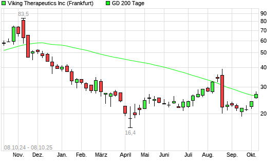 Mit dem Anstieg auf 27,34 EUR hat die Viking Therapeutics-Aktie am 07.10.2025 die 200-Tage-Linie nach oben gekreuzt.Die Viking Therapeutics-Aktie befand sich seit dem 19.08.2025 im langfristigen ...weiterlesen