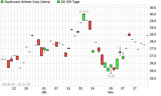 Mit dem Anstieg auf 27,80 EUR hat die Southwest Airlines-Aktie am 20.11.2025 die 200-Tage-Linie nach oben gekreuzt.Die Southwest Airlines-Aktie befand sich seit dem 18.11.2025 im langfristigen ...weiterlesen