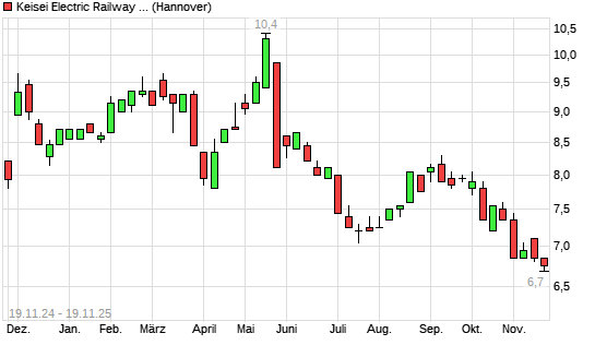 Mit dem Rücksetzer auf 6,75 EUR hat die Keisei Electric Railway-Aktie (ISIN JP3278600006) am 18.11.2025 ein neues 5-Jahres-Tief erreicht und damit den Kurs vom 14.11.2025 eingestellt.Die ...weiterlesen