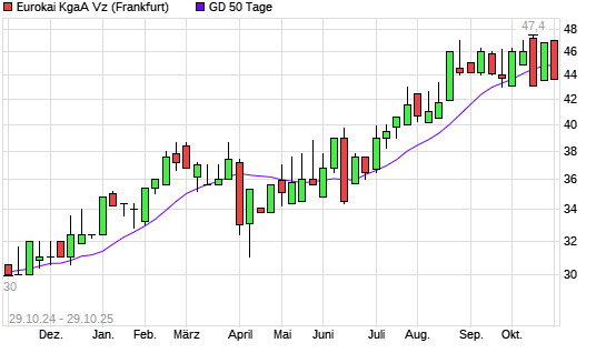 Mit dem Rücksetzer auf 44,80 EUR hat die Eurokai-Aktie am 28.10.2025 die 50-Tage-Linie nach unten gekreuzt.Die Eurokai-Aktie befindet sich seit dem 11.04.2025 im langfristigen Aufwärtstrend ...weiterlesen