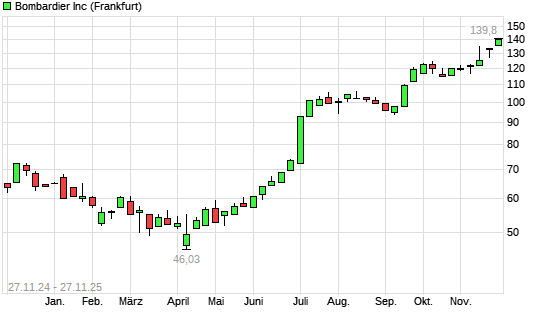 Mit dem Anstieg auf 139,65 EUR hat die Bombardier-Aktie (ISIN CA0977518616) am 26.11.2025 ein neues 10-Jahres-Hoch erreicht und damit den Kurs vom 24.11.2025 eingestellt.Die Bombardier-Aktie ...weiterlesen