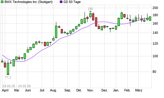 Mit dem Anstieg auf 179,90 EUR hat die BWX Technologies-Aktie am 23.03.2026 die 50-Tage-Linie nach oben gekreuzt.Die BWX Technologies-Aktie befindet sich seit dem 26.05.2025 ...weiterlesen