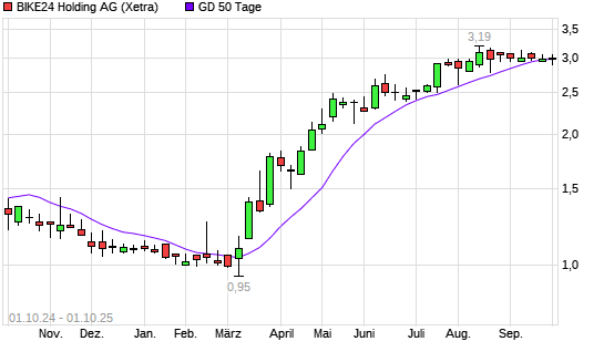 Mit dem Anstieg auf 3,00 EUR hat die BIKE24 Holding AG-Aktie am 30.09.2025 die 50-Tage-Linie nach oben gekreuzt.Die BIKE24 Holding AG-Aktie befindet sich seit dem 10.03.2025 im langfristigen ...weiterlesen