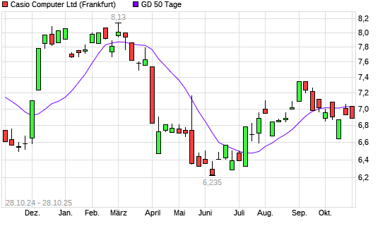 Mit dem Anstieg auf 7,03 EUR hat die Casio Computer-Aktie am 27.10.2025 die 50-Tage-Linie nach oben gekreuzt.Die Casio Computer-Aktie befindet sich seit dem 23.10.2025 im langfristigen Abwärtstrend ...weiterlesen