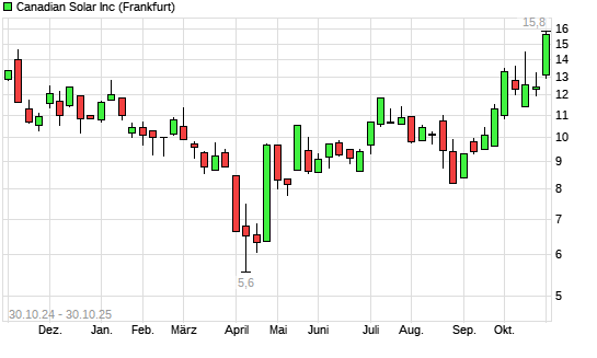 Mit dem Anstieg auf 15,64 EUR hat die Canadian Solar-Aktie (ISIN CA1366351098) am 29.10.2025 ein neues 12-Monats-Hoch erreicht und damit den Kurs vom 04.11.2024 eingestellt.Die Canadian Solar-Aktie ...weiterlesen