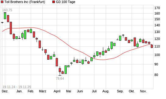 Mit dem Rücksetzer auf 108,40 EUR hat die Toll Brothers-Aktie am 18.11.2025 die 100-Tage-Linie nach unten gekreuzt.Die Toll Brothers-Aktie befindet sich seit dem 14.08.2025 im langfristigen ...weiterlesen