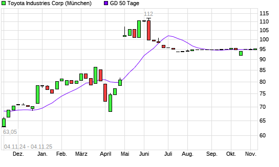 Mit dem Anstieg auf 94,00 EUR hat die Toyoda Automatic Loom Works-Aktie am 03.11.2025 die 50-Tage-Linie nach oben gekreuzt.Die Toyoda Automatic Loom Works-Aktie befindet sich seit dem 14.04.2025 ...weiterlesen