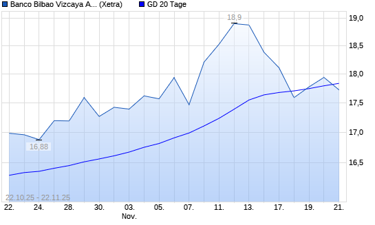 Mit dem Rücksetzer auf 17,60 EUR hat die BBVA-Aktie am 21.11.2025 die 20-Tage-Linie nach unten gekreuzt.Die BBVA-Aktie befindet sich seit dem 06.01.2025 im langfristigen Aufwärtstrend und ...weiterlesen