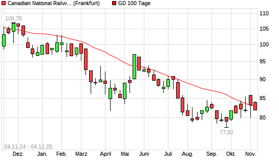 Mit dem Rücksetzer auf 82,80 EUR hat die Canadian National Railway-Aktie am 03.11.2025 die 100-Tage-Linie nach unten gekreuzt.Die Canadian National Railway-Aktie befindet sich seit dem ...weiterlesen