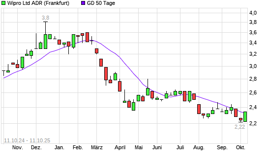 Mit dem Anstieg auf 2,34 EUR hat die Wipro ADR-Aktie am 10.10.2025 die 50-Tage-Linie nach oben gekreuzt.Der Abstand zur 200-Tage-Linie beträgt aktuell -13,30%. ...weiterlesen