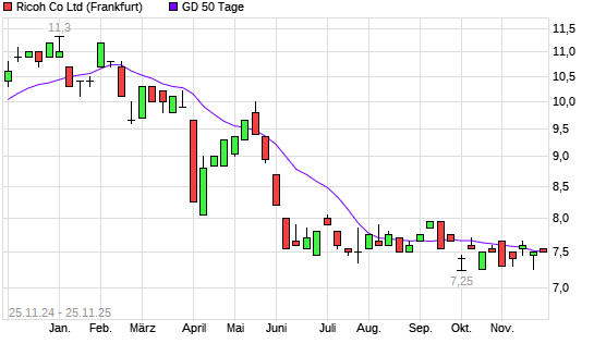 Mit dem Anstieg auf 7,55 EUR hat die Ricoh-Aktie am 24.11.2025 die 50-Tage-Linie nach oben gekreuzt.Die Ricoh-Aktie befindet sich seit dem 14.05.2025 im langfristigen Abwärtstrend und hat in ...weiterlesen