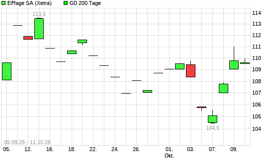 Mit dem Rücksetzer auf 108,20 EUR hat die Eiffage-Aktie am 10.10.2025 die 200-Tage-Linie nach unten gekreuzt.Die Eiffage-Aktie befand sich seit dem 09.10.2025 im langfristigen Aufwärtstrend ...weiterlesen
