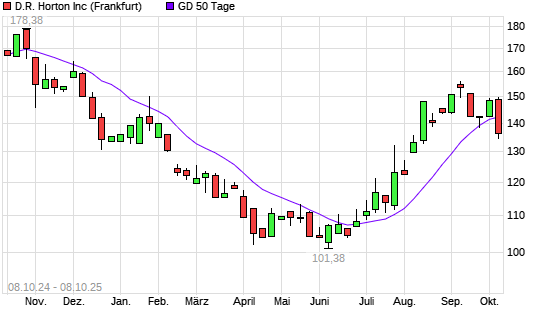 Mit dem Rücksetzer auf 138,46 EUR hat die D.R. Horton-Aktie am 07.10.2025 die 50-Tage-Linie nach unten gekreuzt.Die D.R. Horton-Aktie befindet sich seit dem 04.08.2025 im langfristigen ...weiterlesen
