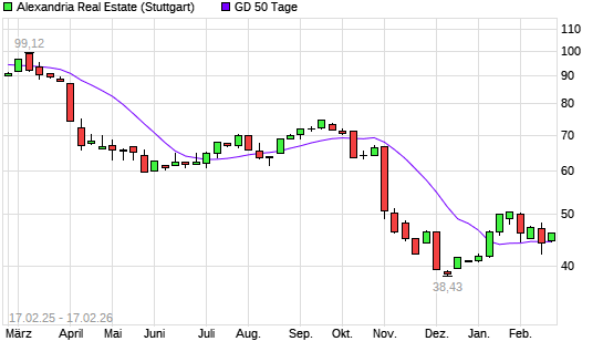Mit dem Anstieg auf 44,62 EUR hat die Alexandria Real Estate-Aktie am 16.02.2026 die 50-Tage-Linie nach oben gekreuzt.Die Alexandria Real Estate-Aktie befindet sich seit dem 25.10.2024 ...weiterlesen