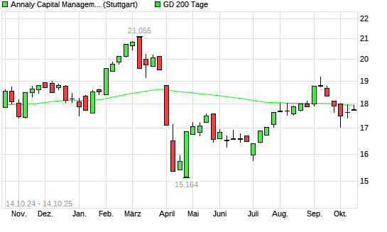 Mit dem Rücksetzer auf 17,71 EUR hat die ANNALY CAPITAL MANAGEMENT-Aktie am 13.10.2025 die 200-Tage-Linie nach unten gekreuzt.Die ANNALY CAPITAL MANAGEMENT-Aktie befand sich seit dem 10.10.2025 ...weiterlesen