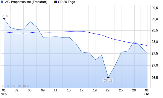 Mit dem Rücksetzer auf 27,79 EUR hat die VICI Properties-Aktie am 30.09.2025 die 20-Tage-Linie nach unten gekreuzt.Die VICI Properties-Aktie befindet sich seit dem 09.09.2025 im langfristigen ...weiterlesen