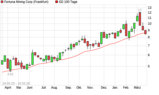 Mit dem Rücksetzer auf 8,48 EUR hat die Fortuna Silver Mines-Aktie am 18.03.2026 die 100-Tage-Linie nach unten gekreuzt.Die Fortuna Silver Mines-Aktie befindet sich seit ...weiterlesen