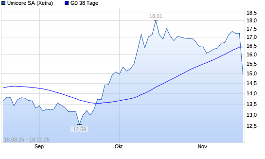 Mit dem Rücksetzer auf 15,73 EUR hat die Umicore-Aktie am 17.11.2025 die 38-Tage-Linie nach unten gekreuzt.Die Umicore-Aktie befindet sich seit dem 04.06.2025 im langfristigen Aufwärtstrend ...weiterlesen