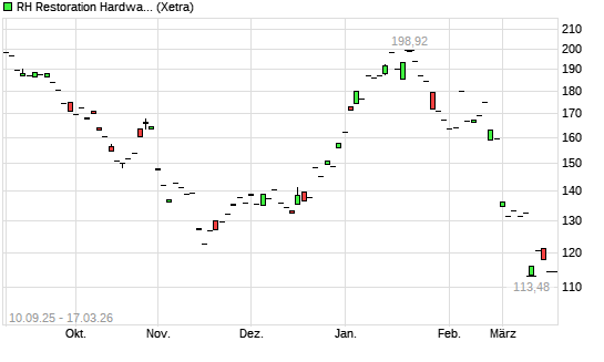 Mit dem Rücksetzer auf 108,22 EUR hat die RH-Aktie (ISIN US74967X1037) am 16.03.2026 ein neues 5-Jahres-Tief erreicht und damit den Kurs vom 13.03.2026 eingestellt.Die ...weiterlesen