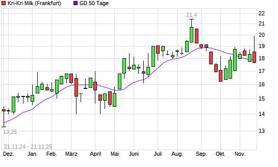 Mit dem Rücksetzer auf 17,60 EUR hat die Kri-Kri Milk-Aktie am 20.11.2025 die 50-Tage-Linie nach unten gekreuzt.Die Kri-Kri Milk-Aktie befindet sich seit dem 21.10.2025 im langfristigen ...weiterlesen