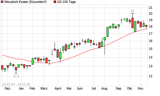 Mit dem Rücksetzer auf 17,70 EUR hat die Mitsubishi Estate-Aktie am 11.11.2025 die 100-Tage-Linie nach unten gekreuzt.Die Mitsubishi Estate-Aktie befindet sich seit dem 10.04.2025 im langfristigen ...weiterlesen
