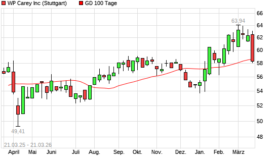 Mit dem Rücksetzer auf 58,08 EUR hat die WP Carey-Aktie am 20.03.2026 die 100-Tage-Linie nach unten gekreuzt.Die WP Carey-Aktie befindet sich seit dem 07.01.2026 im ...weiterlesen