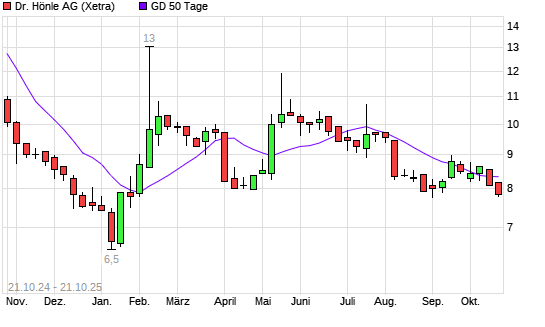 Mit dem Rücksetzer auf 8,00 EUR hat die Dr. Hönle-Aktie am 20.10.2025 die 50-Tage-Linie nach unten gekreuzt.Die Dr. Hönle-Aktie befindet sich seit dem 19.09.2025 im langfristigen Abwärtstrend ...weiterlesen