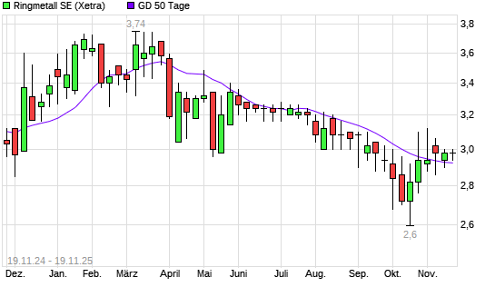 Mit dem Rücksetzer auf 2,78 EUR hat die Ringmetall-Aktie am 18.11.2025 die 50-Tage-Linie nach unten gekreuzt.Die Ringmetall-Aktie befindet sich seit dem 23.07.2025 im langfristigen Abwärtstrend ...weiterlesen