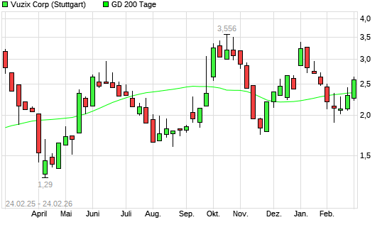 Mit dem Rücksetzer auf 2,26 EUR hat die VUZIX CORP. NEW-Aktie am 23.02.2026 die 200-Tage-Linie nach unten gekreuzt.Die VUZIX CORP. NEW-Aktie befand sich seit dem 20.02.2026 ...weiterlesen