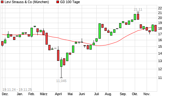 Mit dem Rücksetzer auf 17,47 EUR hat die Levi Strauss & Co-Aktie am 18.11.2025 die 100-Tage-Linie nach unten gekreuzt.Die Levi Strauss & Co-Aktie befindet sich seit dem 02.07.2025 im ...weiterlesen