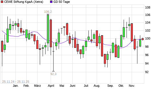 Mit dem Anstieg auf 99,90 EUR hat die Cewe Stiftung-Aktie am 24.11.2025 die 50-Tage-Linie nach oben gekreuzt.Die Cewe Stiftung-Aktie befindet sich seit dem 20.11.2025 im langfristigen Aufwärtstrend ...weiterlesen