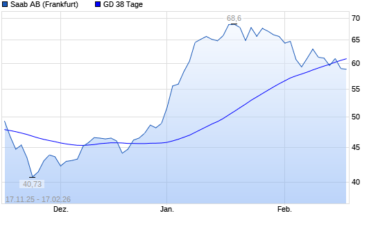 Mit dem Rücksetzer auf 58,97 EUR hat die Saab AB-Aktie am 16.02.2026 die 38-Tage-Linie nach unten gekreuzt.Die Saab AB-Aktie befindet sich seit dem 17.12.2025 im ...weiterlesen