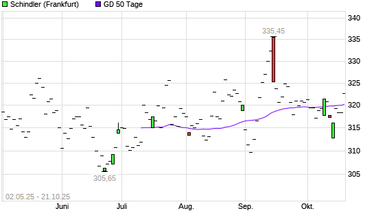 Mit dem Anstieg auf 322,55 EUR hat die Schindler-Aktie am 20.10.2025 die 50-Tage-Linie nach oben gekreuzt.Die Schindler-Aktie befindet sich seit dem 29.11.2023 im langfristigen Aufwärtstrend ...weiterlesen