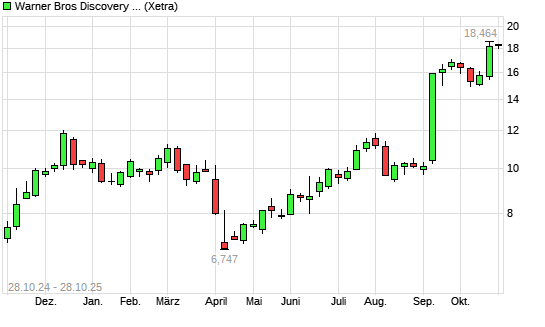 Mit dem Anstieg auf 18,19 EUR hat die Warner Bros Discovery-Aktie (ISIN US9344231041) am 27.10.2025 ein neues 3-Jahres-Hoch erreicht und damit den Kurs vom 24.10.2025 eingestellt.Die Warner ...weiterlesen