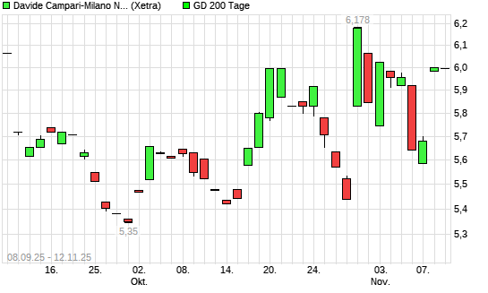 Mit dem Anstieg auf 5,88 EUR hat die Davide Campari-Milano-Aktie am 11.11.2025 die 200-Tage-Linie nach oben gekreuzt.Die Davide Campari-Milano-Aktie befand sich seit dem 06.11.2025 im langfristigen ...weiterlesen
