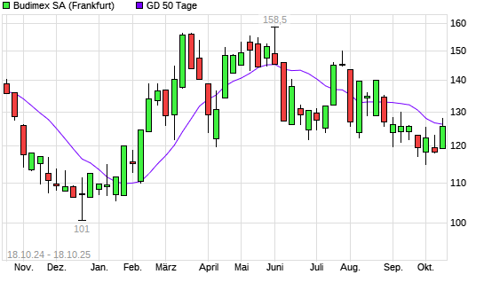 Mit dem Rücksetzer auf 125,55 EUR hat die Budimex-Aktie am 17.10.2025 die 50-Tage-Linie nach unten gekreuzt.Die Budimex-Aktie befindet sich seit dem 27.08.2025 im langfristigen Abwärtstrend ...weiterlesen