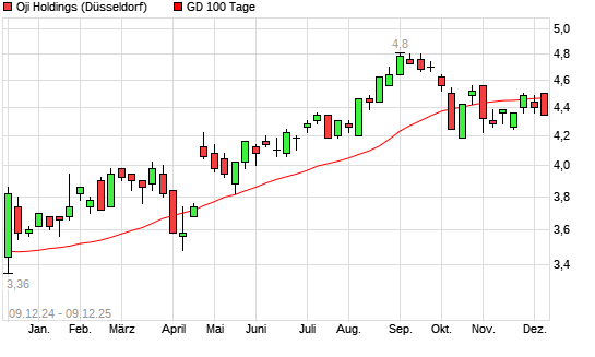 Mit dem Anstieg auf 4,50 EUR hat die Oji Holdings-Aktie am 08.12.2025 die 100-Tage-Linie nach oben gekreuzt.Die Oji Holdings-Aktie befindet sich seit dem 14.04.2025 im langfristigen Aufwärtstrend ...weiterlesen
