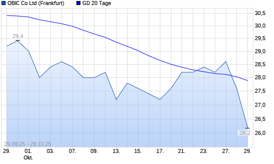 Mit dem Rücksetzer auf 27,60 EUR hat die Obic-Aktie am 28.10.2025 die 20-Tage-Linie nach unten gekreuzt.Die Obic-Aktie befindet sich seit dem 26.09.2025 im langfristigen Abwärtstrend und ...weiterlesen