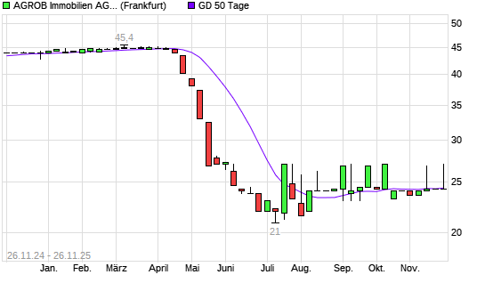 Mit dem Rücksetzer auf 24,20 EUR hat die Agrob VZ-Aktie am 25.11.2025 die 50-Tage-Linie nach unten gekreuzt.Die Agrob VZ-Aktie befindet sich seit dem 22.04.2025 im langfristigen Abwärtstrend ...weiterlesen