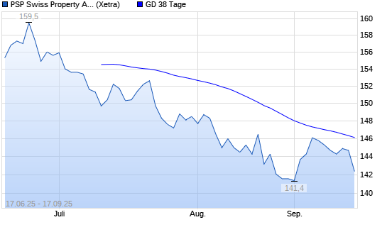 Mit dem Rücksetzer auf 144,40 EUR hat die PSP Swiss Property-Aktie am 16.09.2025 die 38-Tage-Linie nach unten gekreuzt.Die PSP Swiss Property-Aktie befindet sich seit dem 09.09.2025 im ...weiterlesen