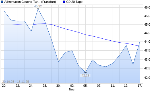Mit dem Anstieg auf 44,00 EUR hat die Alimentation Couche-Tard-Aktie am 17.11.2025 die 20-Tage-Linie nach oben gekreuzt.Die Alimentation Couche-Tard-Aktie befindet sich seit dem 28.10.2025 im ...weiterlesen