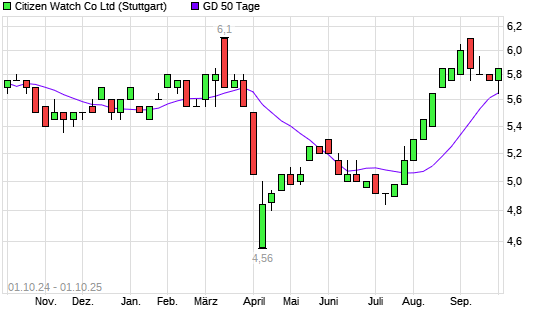 Mit dem Rücksetzer auf 5,60 EUR hat die Citizen-Aktie am 30.09.2025 die 50-Tage-Linie nach unten gekreuzt.Die Citizen-Aktie befindet sich seit dem 08.08.2025 im langfristigen Aufwärtstrend ...weiterlesen