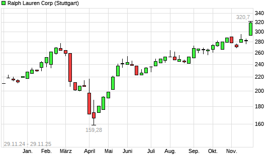 Mit dem Anstieg auf 317,10 EUR hat die Ralph Lauren-Aktie (ISIN US7512121010) am 28.11.2025 ein neues All-Time-High erreicht und damit den Kurs vom 26.11.2025 eingestellt.Die Ralph Lauren-Aktie ...weiterlesen