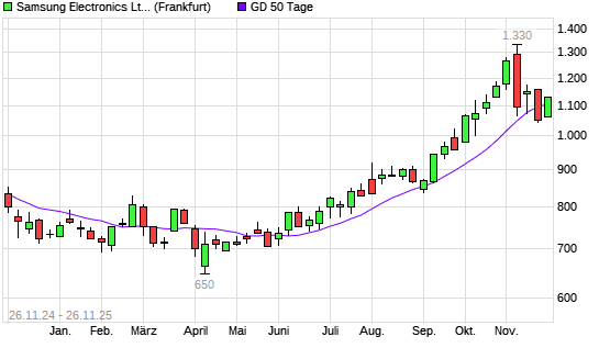Mit dem Rücksetzer auf 1.076,00 EUR hat die Samsung-Aktie am 25.11.2025 die 50-Tage-Linie nach unten gekreuzt.Die Samsung-Aktie befindet sich seit dem 24.06.2025 im langfristigen Aufwärtstrend ...weiterlesen